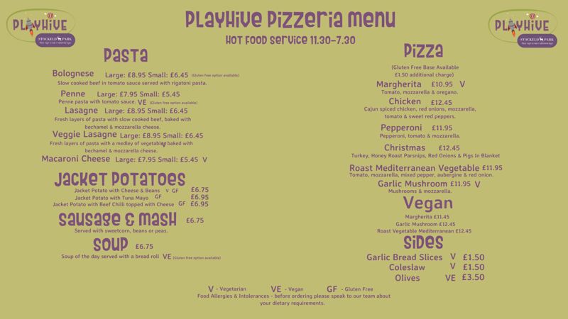 Please note that menus for both the Playhive Pizzeria and Woodland Café are subject to change.